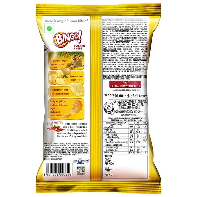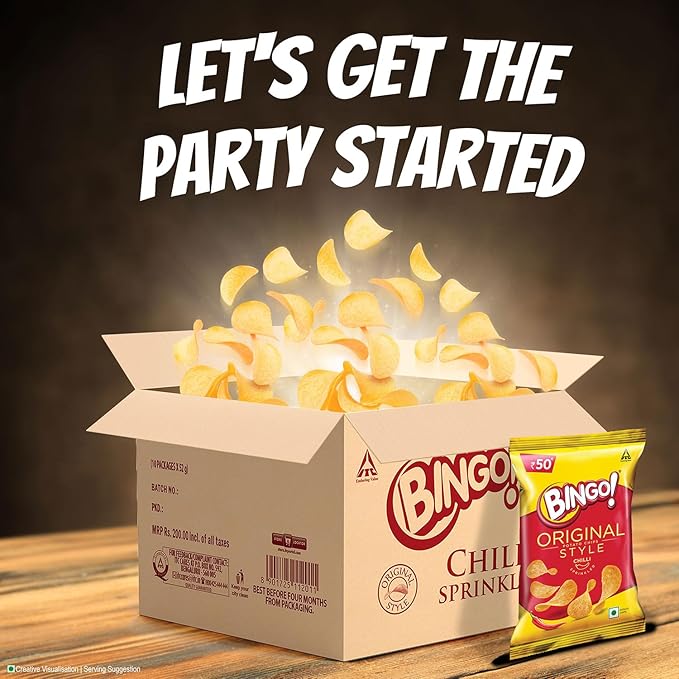 ITC Bingo Original Style (Chilli Sprinkled) chips bring you a classic crispiness with a zesty twist. Lightly salted yet boldly seasoned with chilli powder, these crunchy potato chips deliver a satisfying crunch with every bite. Perfect for spice enthusiasts, they make an irresistible snack for parties, road trips, or casual munching. Pair with your favorite dip, soda, or enjoy straight from the bag—the spicy punch is ready whenever you are.
